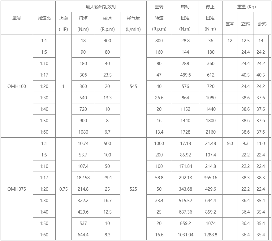 型号:QMH100 材质:①壳体:ZL111铝合金;②轴承:瑞典进口SKF或德国BEM;③输出轴(转子):40CR; ④其他:球墨。 产品描述:QMH100活塞式气动马达,耗气量小、转速较快、扭矩较大、重量轻,具体的参数请看下表;