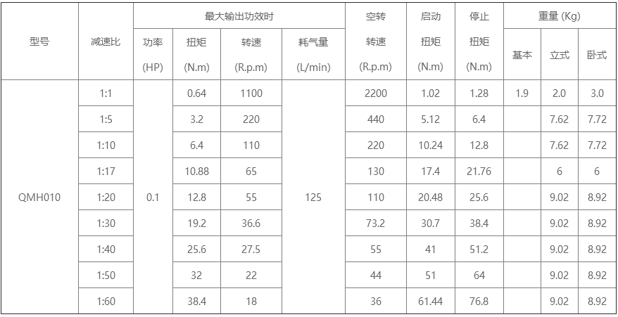 产品描述:①QMH010-F活塞式气动马达,耗气量小、转速较快、扭矩较大、重量轻,具体的参数请看下表;